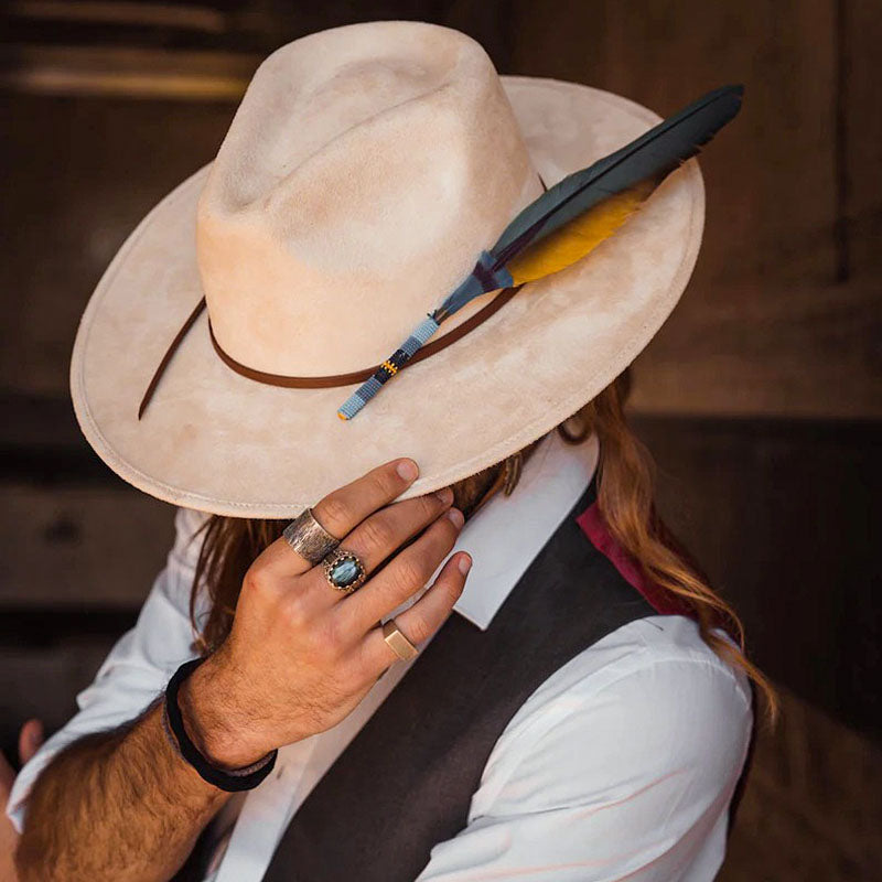 “Handmade from 100% wool felt in the United States, this vintage and unique fedora hat is crafted in an environmentally friendly environment. Each hat is manually processed, aged, fire baked, and painted, resulting in a one-of-a-kind piece. The high-quality Australian wool is breathable and natural, while the sweatband features a non-adjustable synthetic belt with an engraved logo. The package includes two hat paddings to reduce the circumference if needed. Store this hat flat in the provided box to avoid dust and warping. Free shipping is included. This wool fedora hat is perfect for outdoor activities and offers great comfort all day long.”