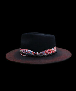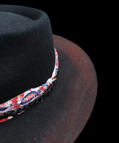 “Distressed Fedora with Red and White Patterned Band” is hand-distressed, hand-dyed, and hand-torched, ensuring no two share the same color or design. Each piece is uniquely imperfect, with subtle variations from product images.