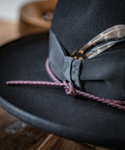 Modern Felt Hat, This is a medium height centre dent with 7 cm / 2.75″ overwelt pencil roll brim. It features 38 mm modern grosgrain hatband with a double back bow & leather cord.