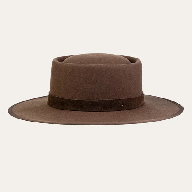 The Oppenheimer Hat is crafted of soft 100% Australian wool felt, this brown hat combines a classic, telescope crown and wide brim. A beloved by men, it is classically trimmed with a brown ribbon hatband. Our blocking shape allows for a flat, indented telescope crown and wide brim, which will go with just about anything you wear. Great for event parades, daily wear, or a 20s theme party.
