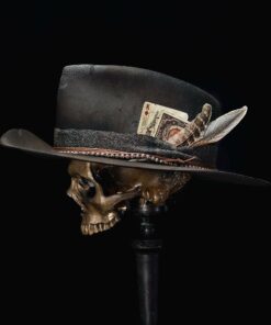 A short brim tall crown Teardrop in Black European Hare with a Marksman Curl on the brim. Wrapped in upholstery fabric, leather cord, and copper beads. Finished with a double card (including a Billy the Kid and king of diamonds) and feather detail.