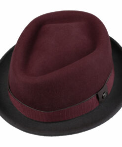 This pork pie hat combines two strong colours in a trendy two-tone look. The brim contrasts starkly with the crown, while the double layer of grosgrain ribbon trim picks up on the colour scheme. With its turned-up brim, diamond-shaped crown and typically jaunty finish, this hat rounds off casual outfits and looks just as good strolling around town as it does when visiting your favourite club.