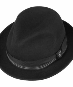 Supple wool felt gives this hat its pleasant feel and, together with a skin-friendly lining made of cotton, makes it comfortable to wear. The plain design of the felt hat with narrow brim is complemented by a subtly striped grosgrain ribbon trim with brand pin, which emphasises the hat’s neat charm. This trilby can be worn on everyday outings, but also makes a great club hat.
